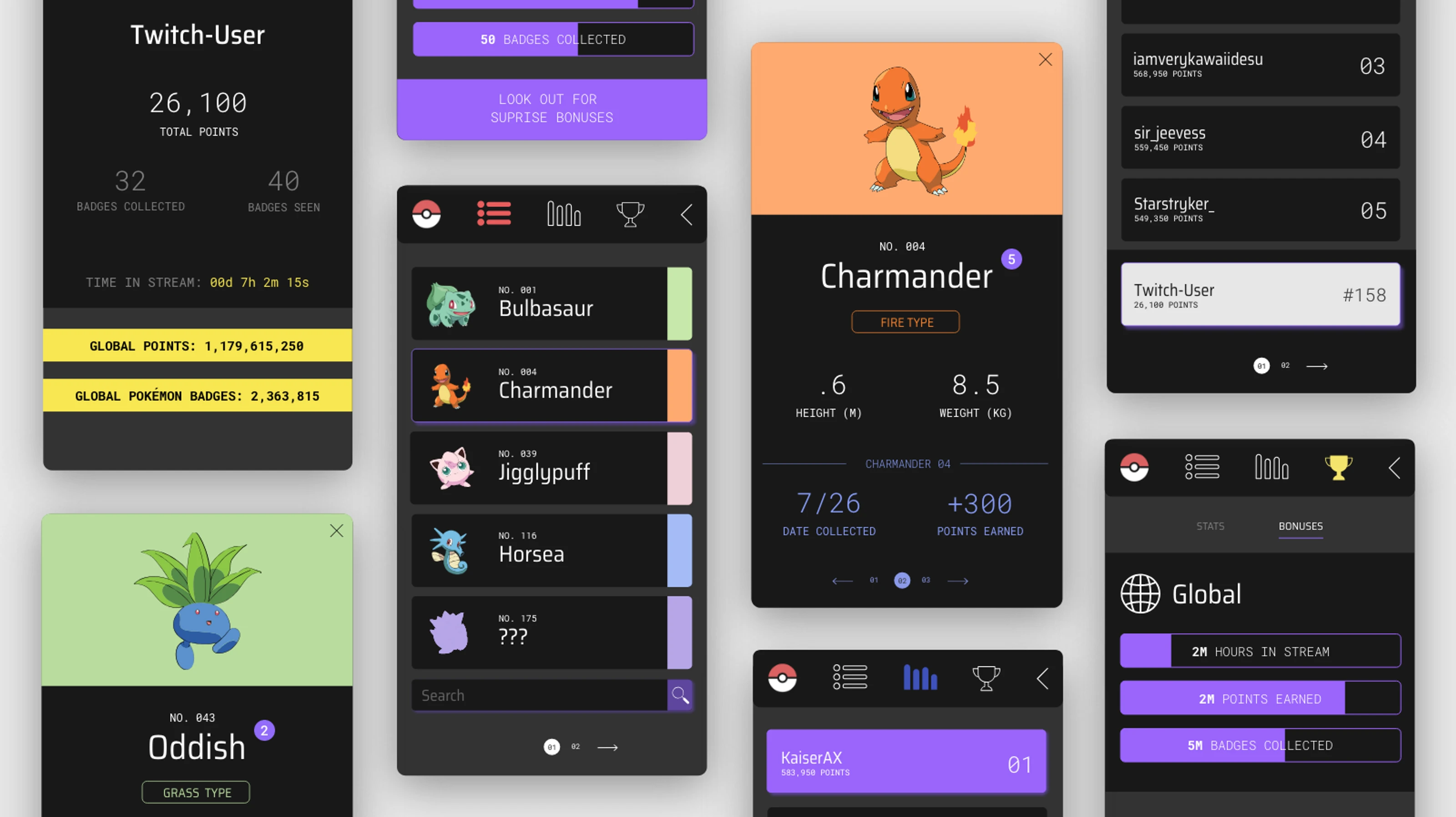 The Extension consists of three main panels: the Inventory where collected Pokémon badges are stored, Stats & Bonuses where viewers can track their progress, and the Leaderboard where the top twenty high-scorers worldwide are celebrated.